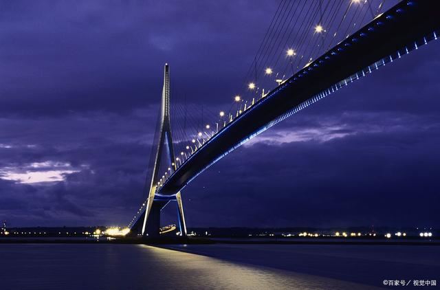 法國諾曼底大橋,由M.Virlogeux設計,主跨856米,為混合梁,建成于1995年。它是一座與當?shù)鼐坝^完美協(xié)調的斜拉橋,并以其細長的結構和典雅的造型而著稱。諾曼底大橋被譽為“20世紀世界最美的橋梁”。