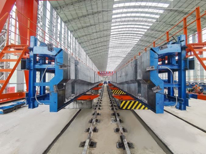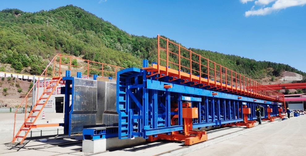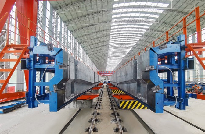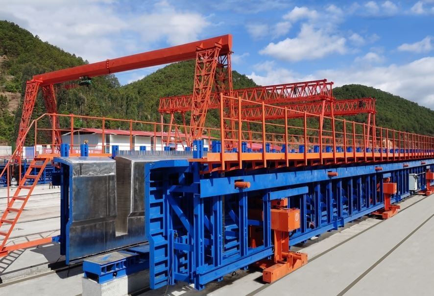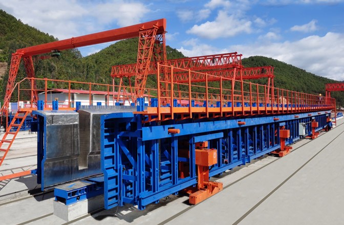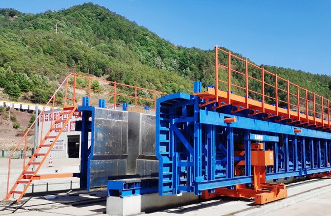 縱移式液壓T梁模板可通過(guò)自帶動(dòng)力的縱移小車沿軌道將外側(cè)模模板整體縱移至下一個(gè)制梁臺(tái)座,實(shí)現(xiàn)一套外側(cè)模配多套底模,提高了施工效率。外側(cè)模通過(guò)液壓系統(tǒng)實(shí)現(xiàn)自動(dòng)化立模、脫模,減輕了工人勞動(dòng)強(qiáng)度,提高了立模、脫模效率,模板僅需拼裝一次,大大減少了龍門吊使用頻率。