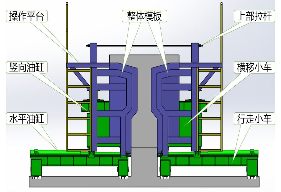 液壓箱梁模板主要由外模、行走小車及液壓系統(tǒng)組成。行走小車及液壓系統(tǒng)實(shí)現(xiàn)外模的自動(dòng)開(kāi)合。